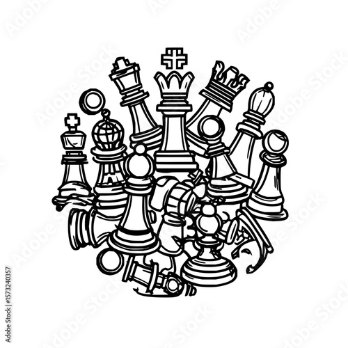 A collection of chess pieces arranged in a circular pattern with a black and white color scheme design