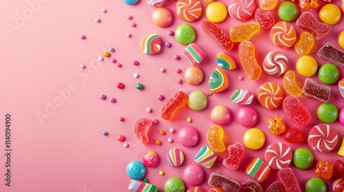A collection of colorful candies on a pink background.
