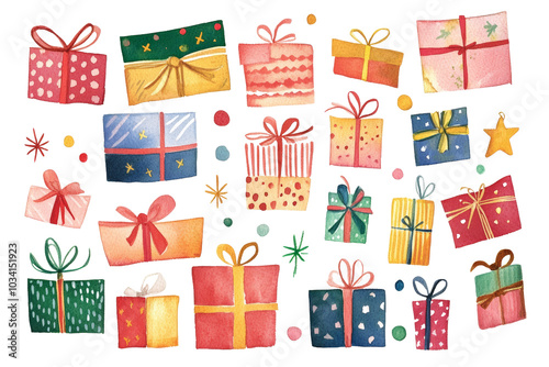 A collection of colorful gift boxes with various patterns and ribbons, perfect for festive occasions.