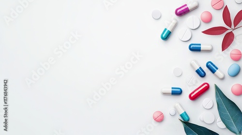 A collection of colorful pills and capsules arranged on a clean background, accompanied by leaves, suggesting themes of health and wellness.