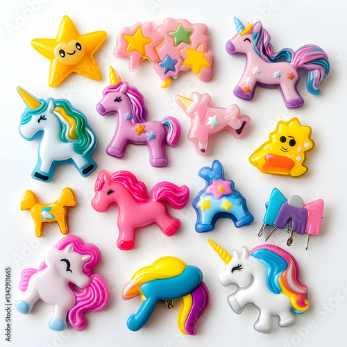 A collection of colorful plastic hair clips featuring unicorn and cartoon character designs, isolated on a white background