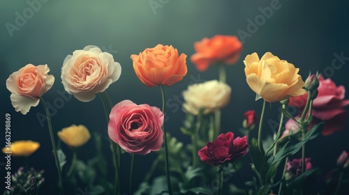 A collection of colorful Ranunculus flowers blooming against a dark green background adding a