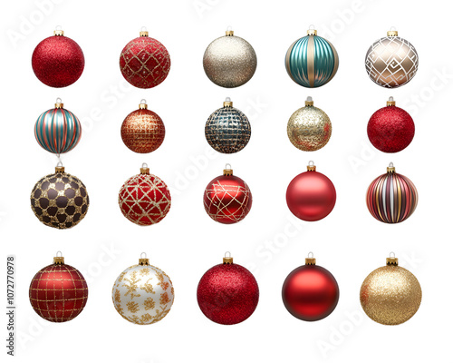 A collection of decorative holiday ornaments in various colors and patterns arranged neatly on a white background, perfect for adding festive cheer to your seasonal decor.