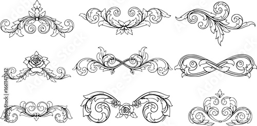 A collection of eight intricately designed black and white ornate floral flourishes and decorative elements