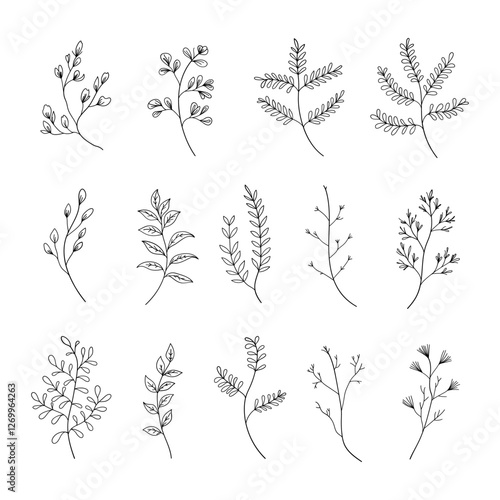 A collection of fine line botanical sketches featuring different plant species. Perfect for minimalist designs, patterns, and nature-inspired projects.