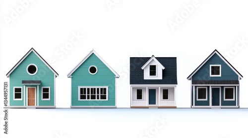 A collection of four colorful small houses, each with distinct designs and colors, arranged in a row against a plain background.