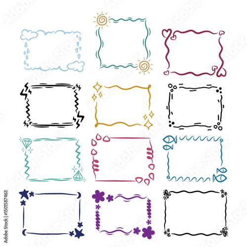 A collection of hand-drawn frames in various rectangular and circular shapes with sketchy, artistic lines and playful detailing.