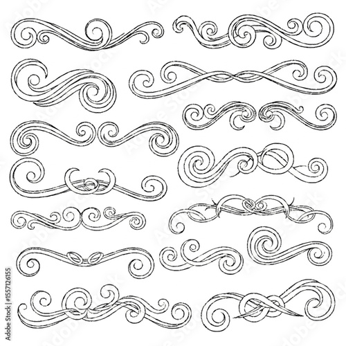 A collection of hand-drawn, ornate swirls and flourishes arranged in horizontal rows.