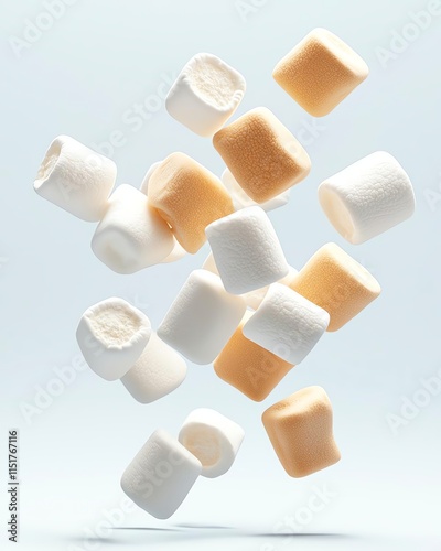A collection of light and fluffy marshmallows floats against a cool blue background, showcasing a delightful mix of soft colors and textures, perfect for a sweet treat or dessert d