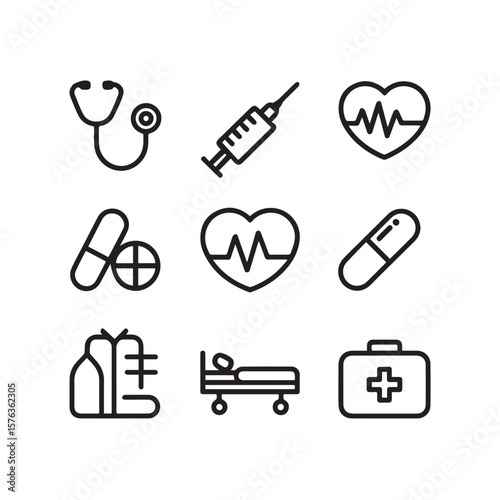 A collection of medical and healthcare icons including a stethoscope, syringe, pills, heartbeat, and hospital bed