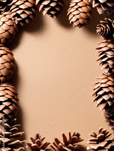 a collection of pine cones arranged around the edges of a plain, light brown background, creating a natural frame. The pine cones are positioned along the top, sides, and bottom