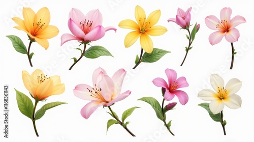 A collection of spring blossoms in various colors and species, with bright and fresh backgrounds, isolated on a white background