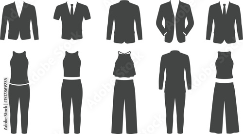 clothing, apparel, suit, jumpsuit, fashion, style, silhouette, greyscale, formal, casual attire, outfit, top, pant, jacket, blazer, attaching, sleeveless, long sleeve, short sleeve, buttons, pocket, collar, crop top, cropped, full-length, evening dress, monochrome, design, icon, symbol, illustration, vector, graphic, template, element, isolated, minimalist, modern, trendy