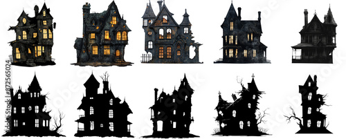 A collection of ten spooky, haunted houses and castles on a transparent background, perfect for Halloween themes and haunted house designs
