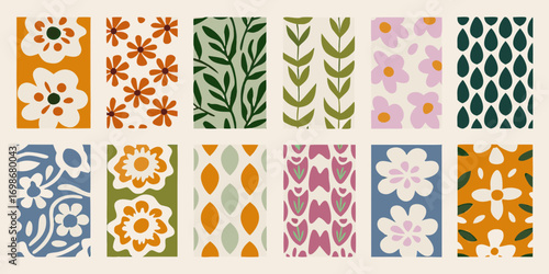 A collection of twelve diverse abstract floral and botanical patterns in earthy tones and pastel hues