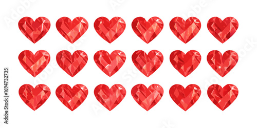 A collection of twelve red heart designs arranged in two rows on a white background. Each heart has a unique artistic style: solid red, outlined, glossy 3D, layered paper effect, striped, scribbled,