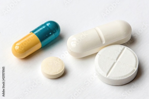 A collection of various pills and capsules in different shapes and colors on a light background.