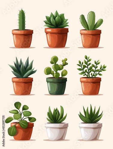 A collection of various potted succulent plants arranged in a grid on a light background. Ideal for home decor and gardening themes.