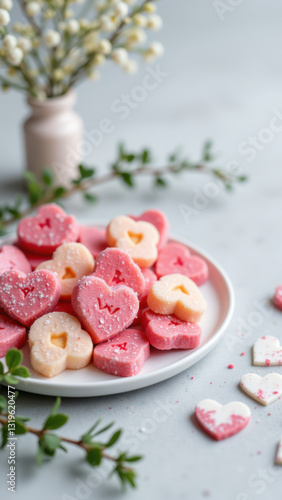 heart-shaped, colourful, confectionery, dessert, food photography, table setting, festive, seasonal, indulgence