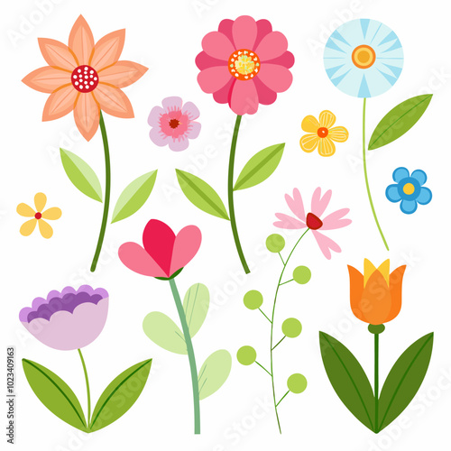 A collection of whimsical, hand-drawn flowers in various colors and styles, perfect for adding a touch of spring to your designs. These cheerful blooms are ideal for greeting cards, invitations.