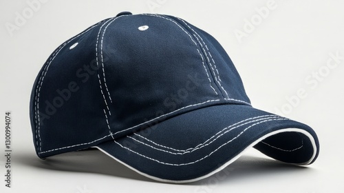 A collegiate-style cap in navy with white embroidery, isolated white background