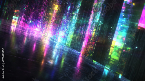 A color prism concept with crystalline structures refracting shades of green, blue, and purple, casting dynamic rainbow streaks across a deep, reflective black surface.