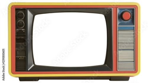 A colorful 1980s-style CRT television set with a blank screen, perfectly isolated on a white background