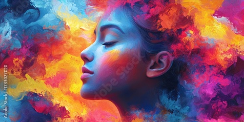 A colorful, abstract painting of a woman's face with vibrant, swirling colors and a blurred, dreamy effect.