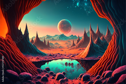 A colorful alien landscape, the fantastic nature of a distant alien planet. Generative AI illustration
