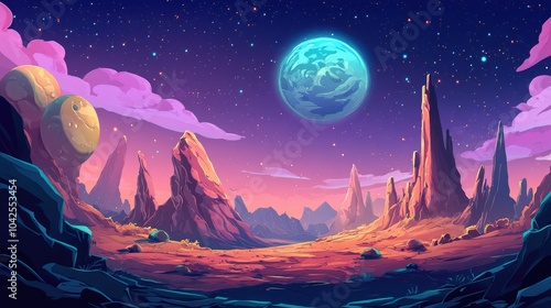 alien, landscape, planet, moon, sky, star, night, blue, red, orange, purple, pink, rock, mountain, cliff, desert, space, mountain, rocky, colourful, distant, horizon, fantasy, whimsical, abstract, artwork, illustration, digital, art, painting, background, nebula, celestial, galaxy, cosmic