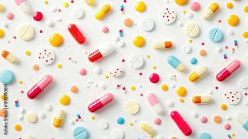 A colorful arrangement of various pills and capsules scattered on a light background, showcasing a vibrant mix of shapes and sizes.