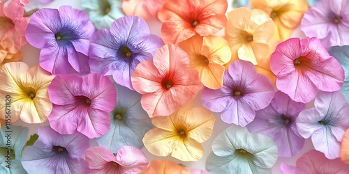 A colorful array of petunias in soft pastel tones, creating a serene vibe against a bright white background.