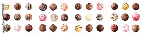 A colorful assortment of chocolate truffles, featuring various designs and flavors, arranged in a neat row, on white background.