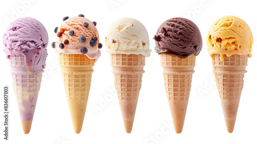 A colorful assortment of five ice cream cones in various flavors, lined up neatly in a row against a white background.