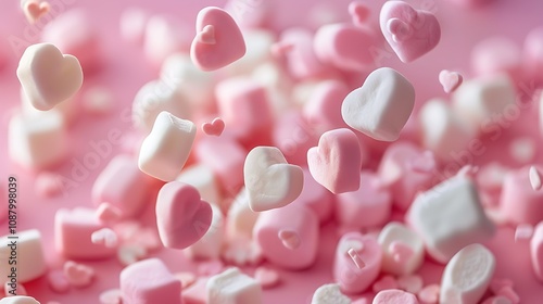 A colorful assortment of heart-shaped marshmallows in pink and white, creating a playful and sweet atmosphere.
