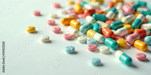 A colorful assortment of pills and capsules scattered on a light surface, representing various medications and treatments
