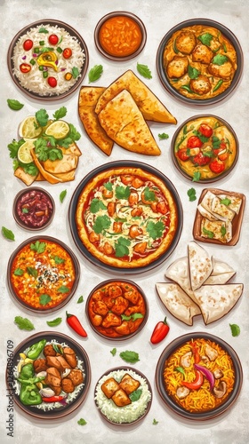 A colorful assortment of traditional Indian dishes is arranged beautifully on a table, featuring a variety of textures and flavors perfect for a festive celebration