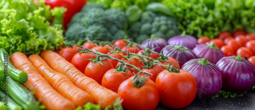 A colorful assortment of vegetables including tomatoes, onions, and carrots