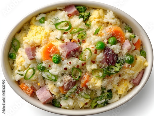A colorful bowl of fried rice with ham, eggs, vegetables, and green onions presented against white background.