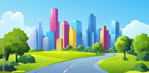 cartoon, illustration, city, park, skyline, urban, landscape, road, green, tree, nature, building, skyscraper, architecture, downtown, blue, sky, summer, sunny, vibrant, colourful, digital, art, drawing, background, scene, view, street, path, grass, foliage, environment, modern, metropolis, city landscape, travel, journey, destination, fantasy, creative, scenic, graphic, picture, image, bright, beautiful, tall, route