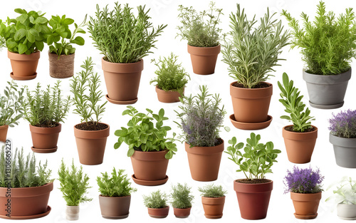 A colorful collection of potted herbs including rosemary, thyme, and sage, isolated on a empty plain background