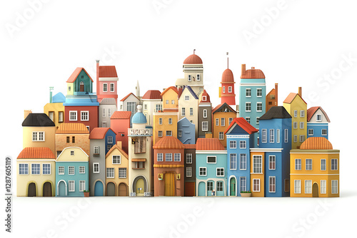 A colorful collection of stylized houses arranged in a whimsical cityscape.
