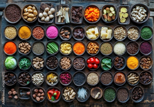 A Colorful Collection of Various Spices, Herbs, and Nuts Arranged in Wooden Bowls on a Rustic Table Displaying a Vivid Palette of Natural Ingredients for Culinary Artistry