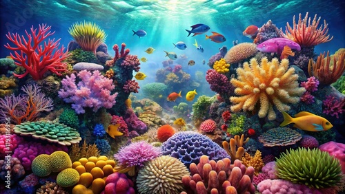 A colorful coral reef teeming with life and vibrant marine flora, coral reef ecosystem, tropical seascape, oceanic zone, coral formation process, marine life