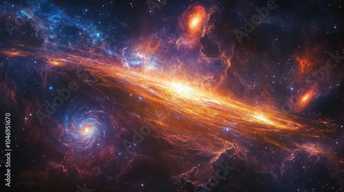 A colorful depiction of outer space with distant galaxies, bright stars, and swirling nebulae.
