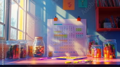 A colorful desk with jars of colorful items, a poster, and a window with sunlight streaming in.