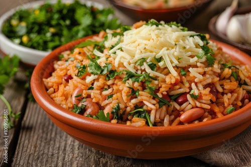 A colorful dish of baio de dois, a traditional rice and beans dish with chunks of cheese and herbs, garnished with fresh cilantro.
