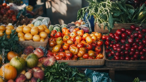 tomatoes, fruit, red, orange, yellow, green, produce, market, stall, basket, wooden, display, fresh, vegetable, ripe, juicy, vibrant, colourful, healthy, organic, natural, delicious, tasty, agriculture, farm, harvest, summer, spring, abundance, bounty, texture, pattern, closeup, detail, food, grocery, shopping, lifestyle, rural, rustic, traditional, local, seasonal, bright, nourishment