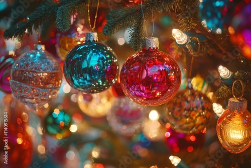 A colorful display of shimmering Christmas ornaments adorning a festive tree, capturing the joy and spirit of the holiday season with intricate details and warm lights.