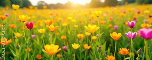 A colorful field of yellow and pink wildflowers in full bloom, botanical, buttercup, wildflower field